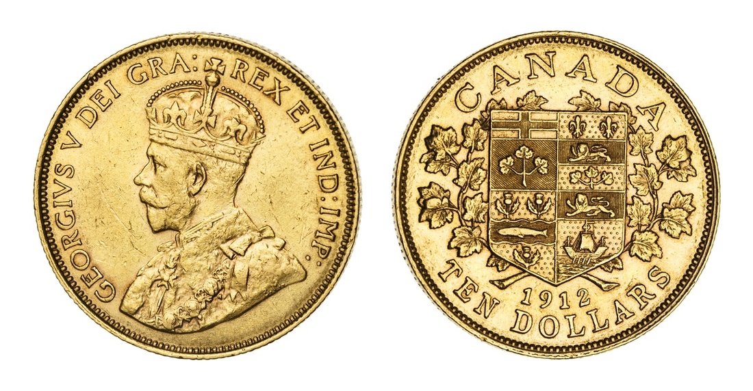 Canada. George V (1910-1936). 10 Dollars, 1912. Crowned bust left, rev. Shield of Arms on crossed maple branches. Fr.3, KM 27. Some light stacking marks. Extremely Fine.