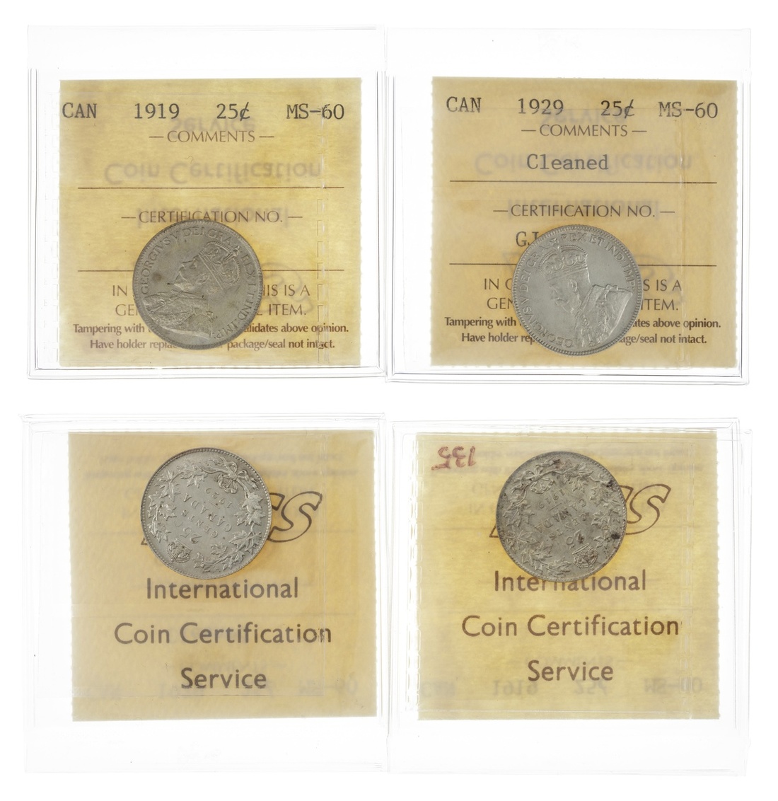 Canada. George V (1910-1936). Pair of ICCS-graded 25 Cent pieces: 1919. MS-60; and 1929. MS-60 Cleaned. Crowned bust left. KM 24, 24a. (2)
