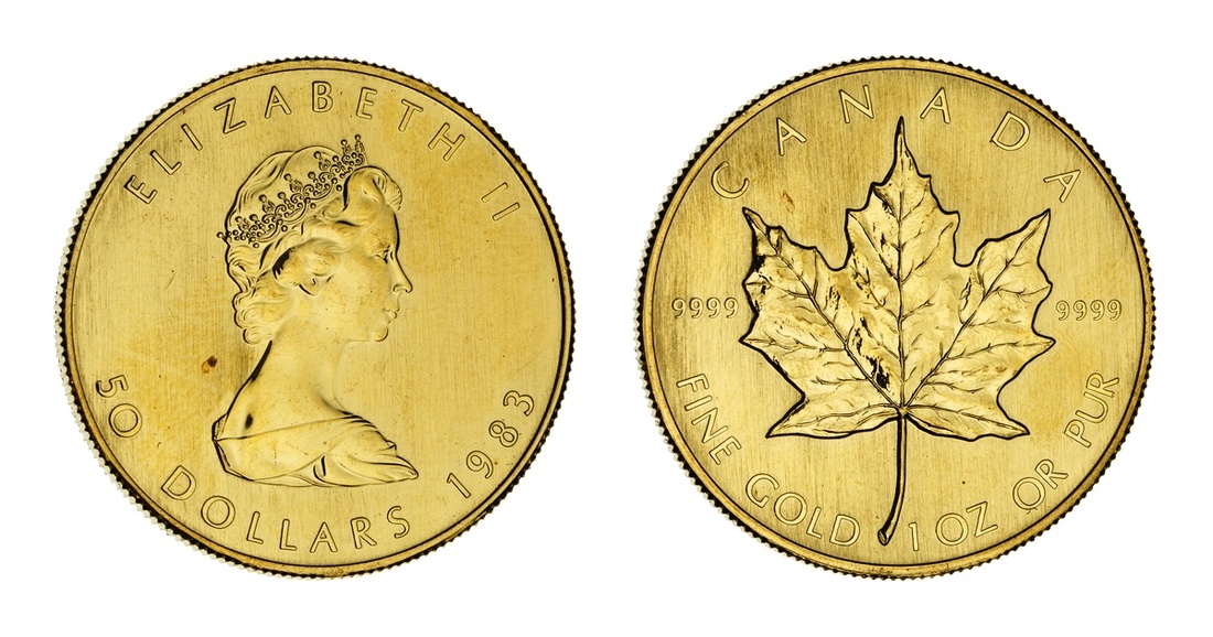 Canada. Elizabeth II (1952-2022). 50 Dollars - 1 Ounce, 1983. Young bust right, value below, rev. Large maple leaf flanked by "9999". KM 125.2. Small toning spot. Choice Brilliant Uncirculated.
