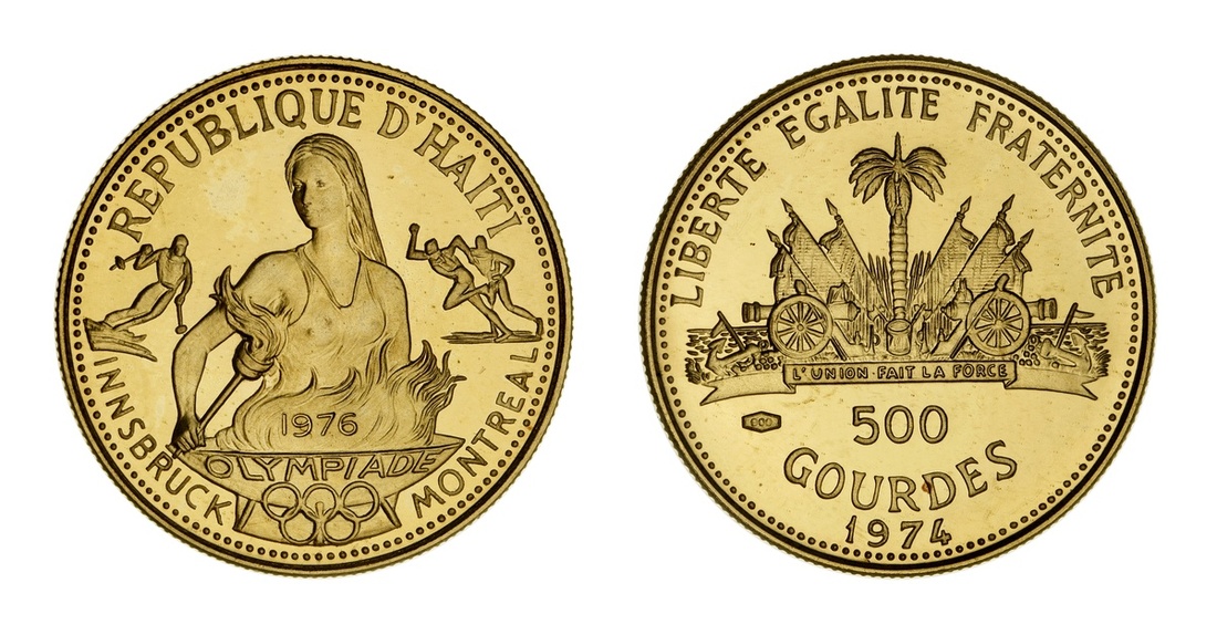 Haiti. Proof 500 Gourdes, 1974. 1976 Olympics. Young woman holding torch, skier - Innsbruck left, runners - Montreal right, rev. Arms. KM 117. 1,140 pieces struck. In original plastic sleeve. Brilliant Proof.