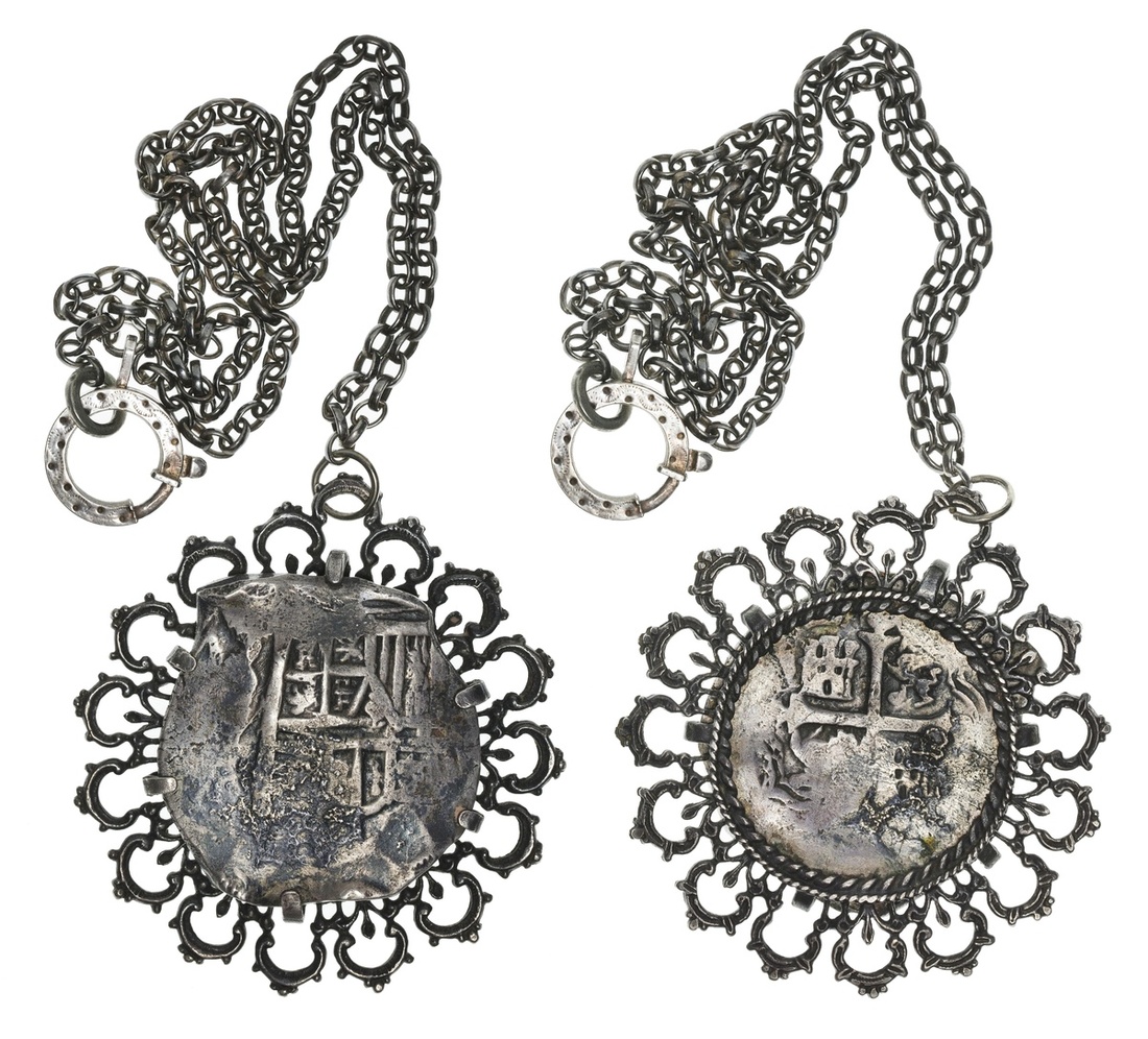 Mexico. Felipe IV (1621-1665). Cob 8 Reales, nm ndv. Recovered from the Lucayan Beach Pirate Treasure Trove of 1628. Set in an openwork silver bezel on chain. With original Spink CoA and case. Salved, typical flat areas. Fine-VF.