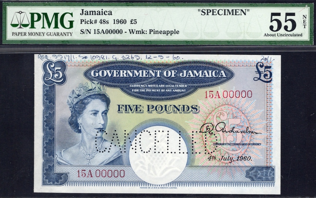 Jamaica. Government of Jamaica. Specimen 5 Pounds. 4th July 1960. P-48s. No. 15A 00000. Blue and multicolor. Wmk. Pineapple. Elizabeth II at left; Factory on back. Stenciled CANCELLED. PMG About Uncirculated 55 Net, printer annotations (top margin front), previously mounted.