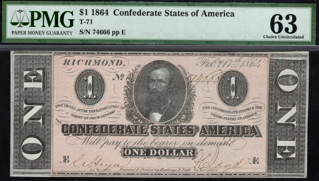 CSA. T-71. $1. Feb. 17, 1864. Cr.574. PF12. No. 74666, plate E. Clement C. Clay at center. Engraved and printed by Keatinge & Ball. PMG Choice Uncirculated 63.
