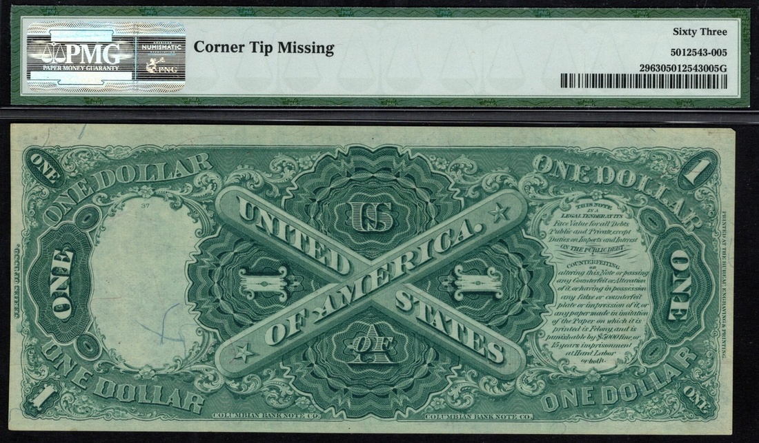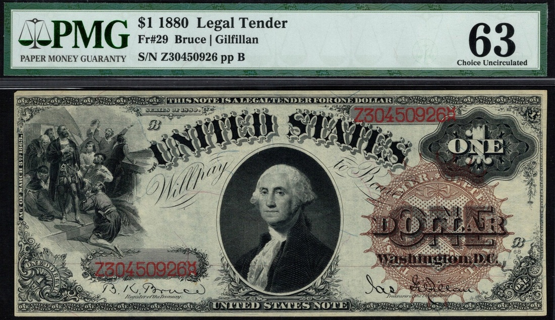 Fr. 29. $1 Legal Tender. 1880. Washington, Columbus sighting land. Bruce-Gilfillan. Large seal, red serial numbers: Z30450926. PMG Choice Uncirculated 63, corner tip missing.