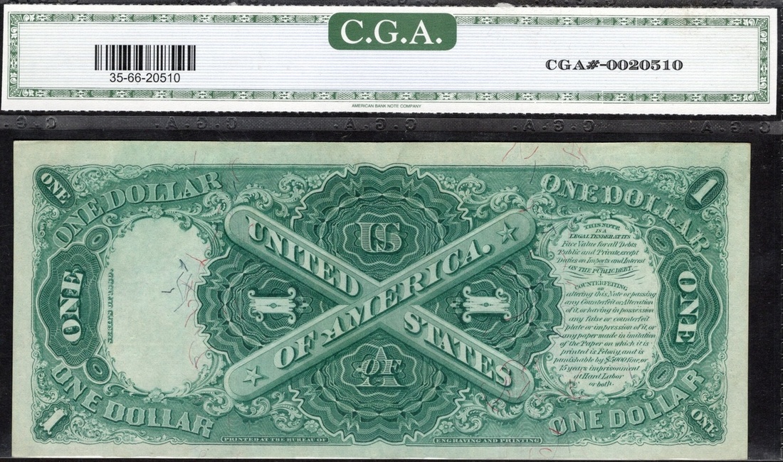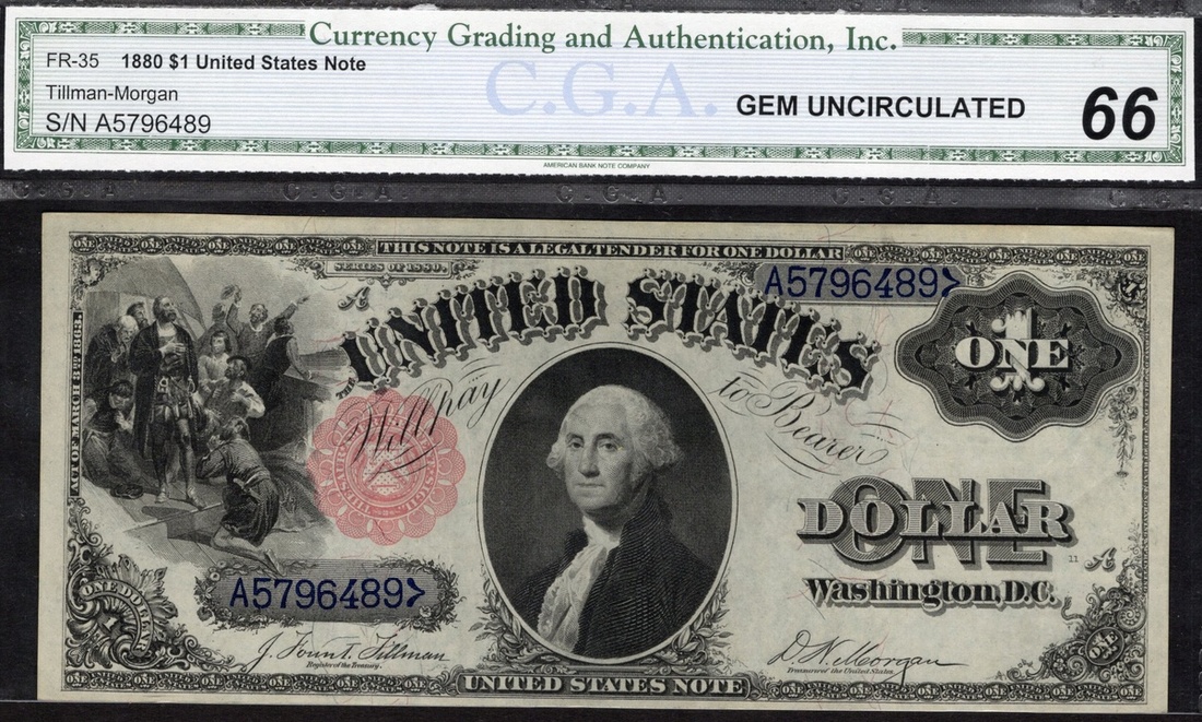 Fr. 35. $1 Legal Tender. 1880. Washington, Columbus. Small red seal, scalloped. Tillman-Morgan. No. A5796489. CGA Gem Uncirculated 66.