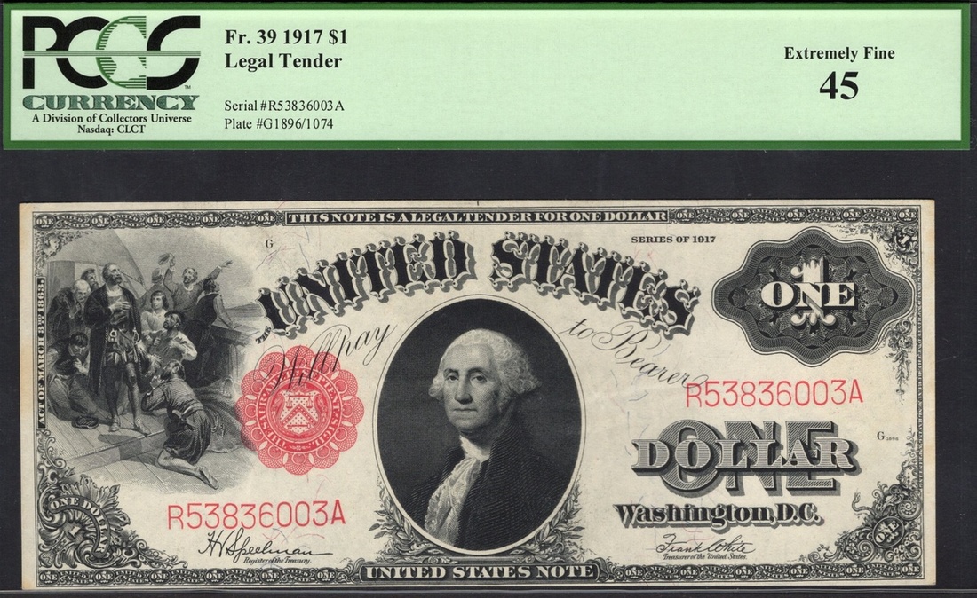 Fr. 39. $1 Legal Tender. 1917. Washington, Columbus. Speelman-White. No. R53836003A. PCGS Extremely Fine 45.