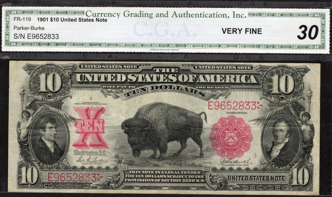 Fr. 119. $10 Legal Tender. 1901. Bison, Lewis and Clark. Parker-Burke. No. E9652833. CGS Very Fine 30.