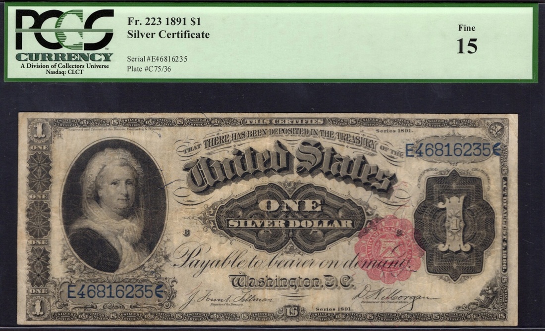 Fr. 223. $1 Silver Certificate. 1891. Martha Washington. Tillman-Morgan. No. E46816235. PCGS Fine 15.