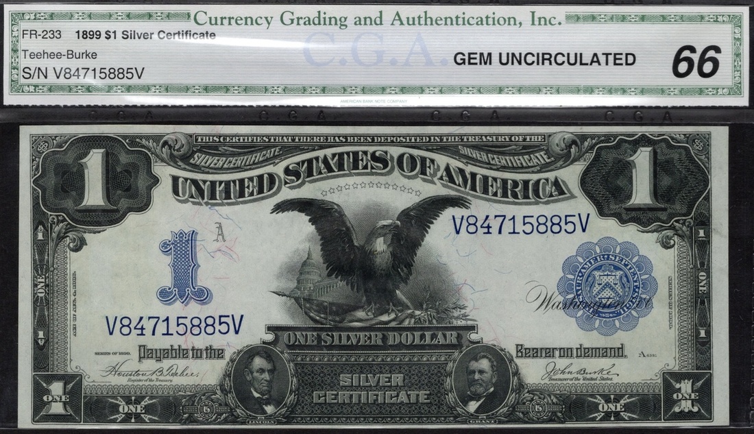 Fr. 233. $1 Silver Certificate. 1899. Black eagle. Teehee-Burke. No. V84715885V. CGA Gem Uncirculated 66.