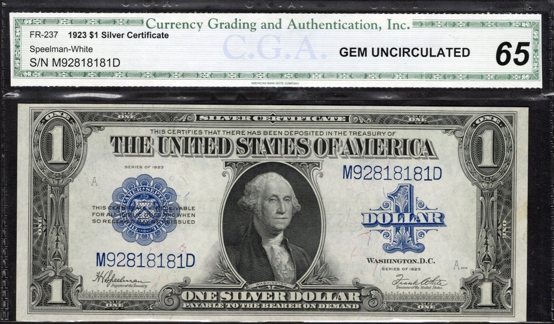 Fr. 237. $1 Silver Certificate. 1923. George Washington. Speelman-White. No. M92818181D. Partial repeater. CGA Gem Uncirculated 65.