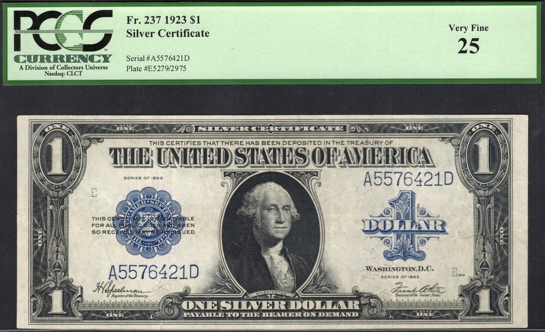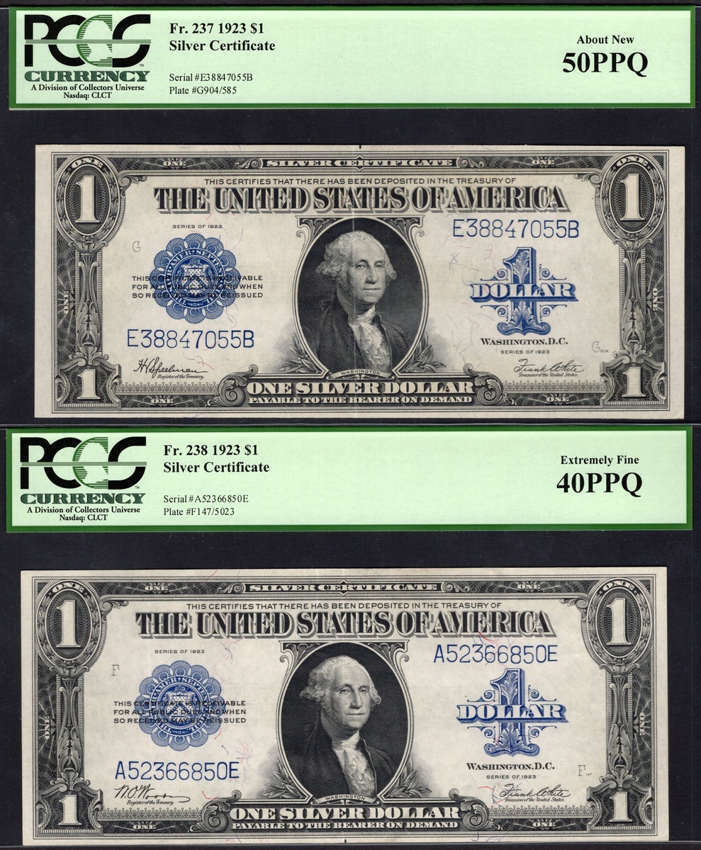 A Quintet of graded $1 Silver Certificates. 1923. Fr.237 (4). Speelman-White. All graded by PCGS: Very Fine 25 (2), About New 50 PPQ, and Choice About New 55 PPQ; Fr.238. Woods-White. PCGS Extremely Fine 40 PPQ. [5]