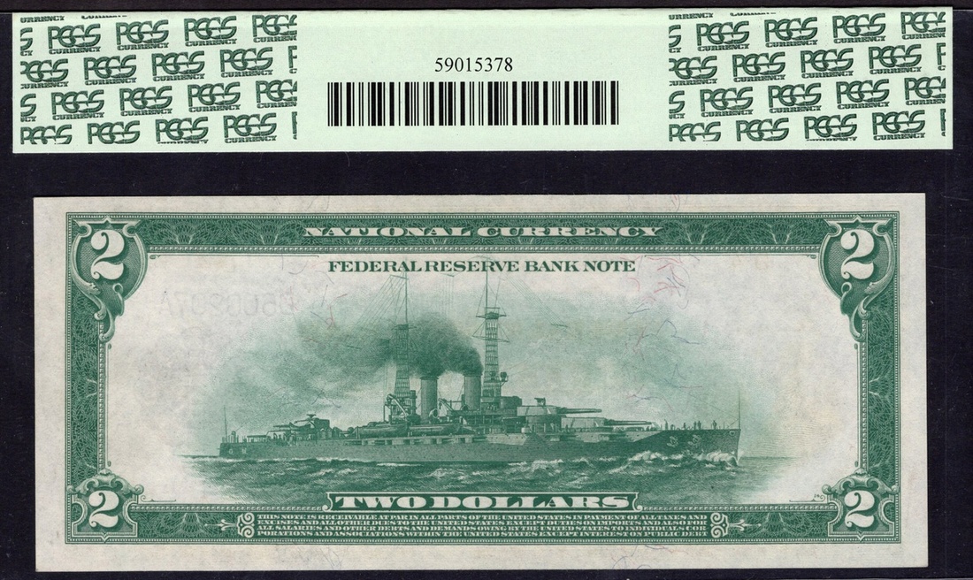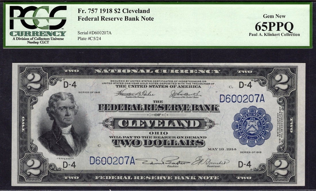 Fr. 757. $2 Federal Reserve Bank Note. 1918. Cleveland. Jefferson; Battleship. Teehee-Burke; Baxter-Fancher. No. D600207A. PCGS Gem New 65 PPQ - Paul A. Klinkert Collection.