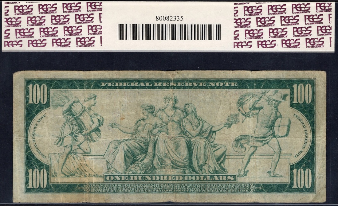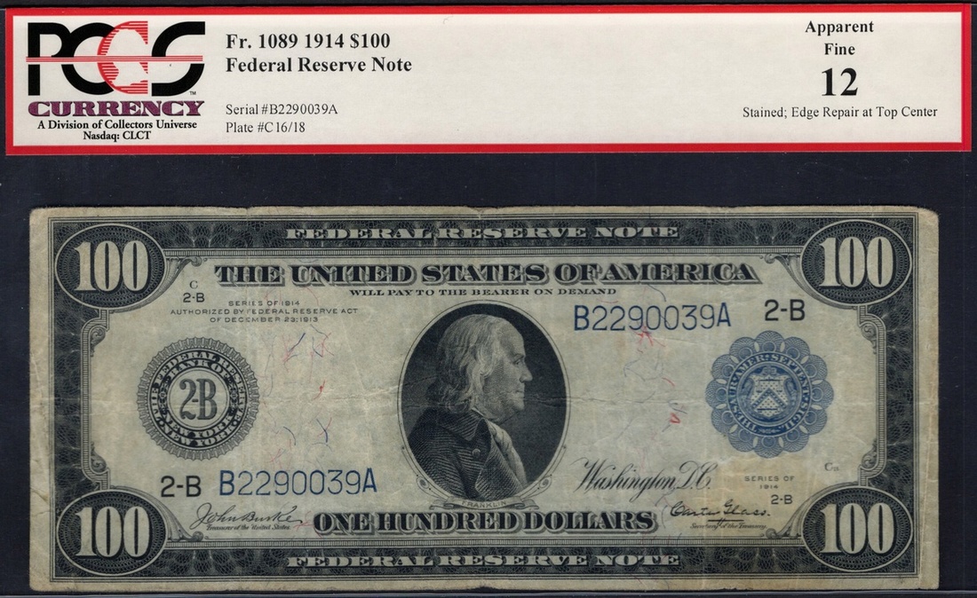 Fr.1089. $100 Federal Reserve Note. 1914. New York. Franklin; Allegorical figures. Burke-Glass. No. B2290039A. PCGS Apparent Fine 12, stained, edge repair at top center.