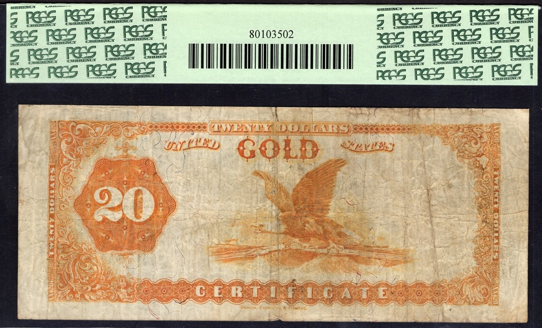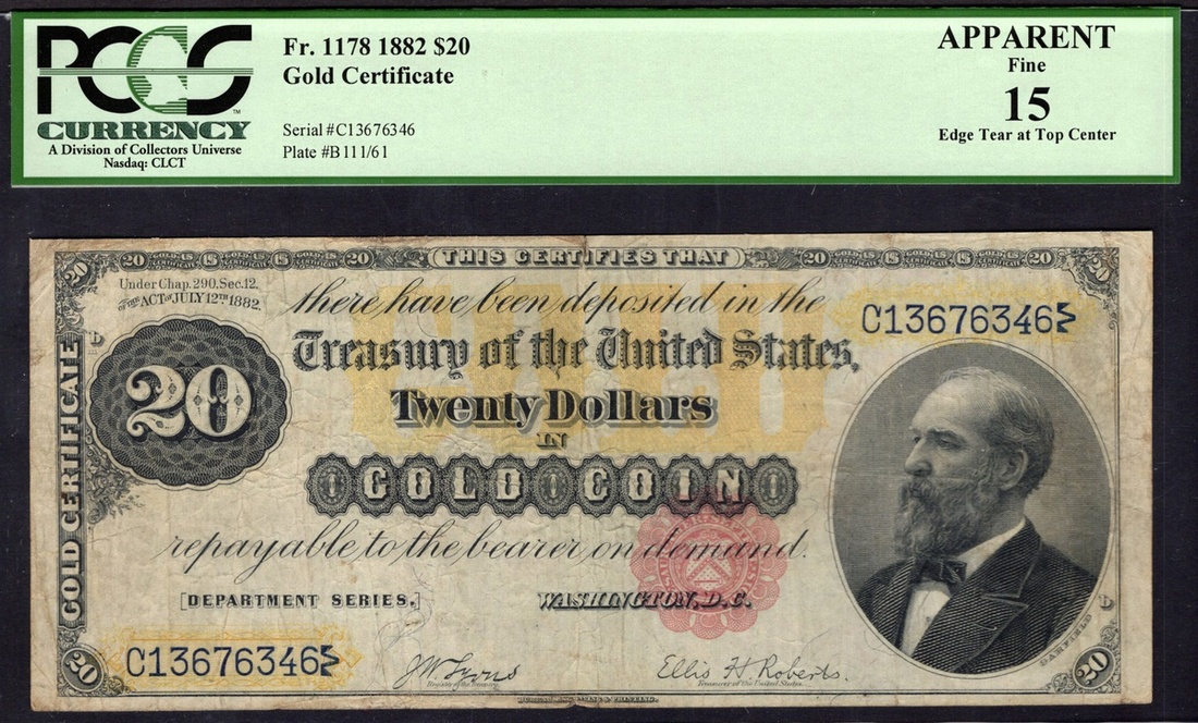 Fr.1178. $20 Gold Certificate. 1882. Small red seal. James Garfield. Lyons-Roberts. No. C13676346. PCGS Apparent Fine 15, edge tear top center.