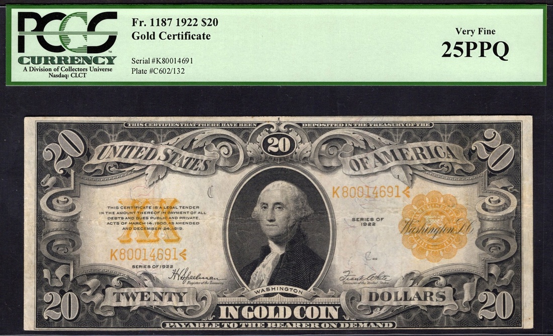 Fr. 1187. $20 Gold Certificate. 1922. George Washington. Speelman-White. No. K80014691. PCGS Very Fine 25 PPQ.