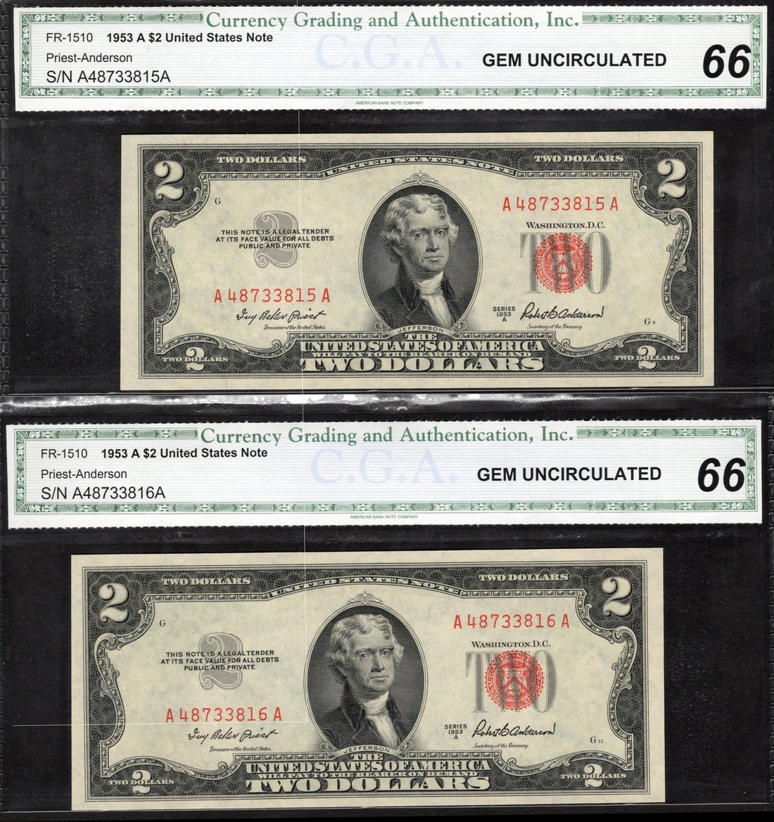 Group of Legal Tender Notes. Fr.1505, 1507. $2. 1928-D, 1928-F. Uncirculated; Fr.1510. 1953-A. Sequential pair. Both CGA Gem Uncirculated 66; and Fr.1526. $5. 1928-A. Fine. [5]