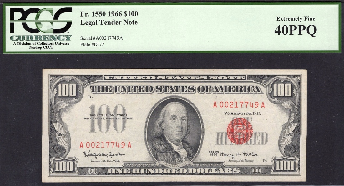 Fr. 1550. $100 Legal Tender. 1966. Franklin. Granahan-Fowler. No. A00217749A. PCGS Extremely Fine 40 PPQ.