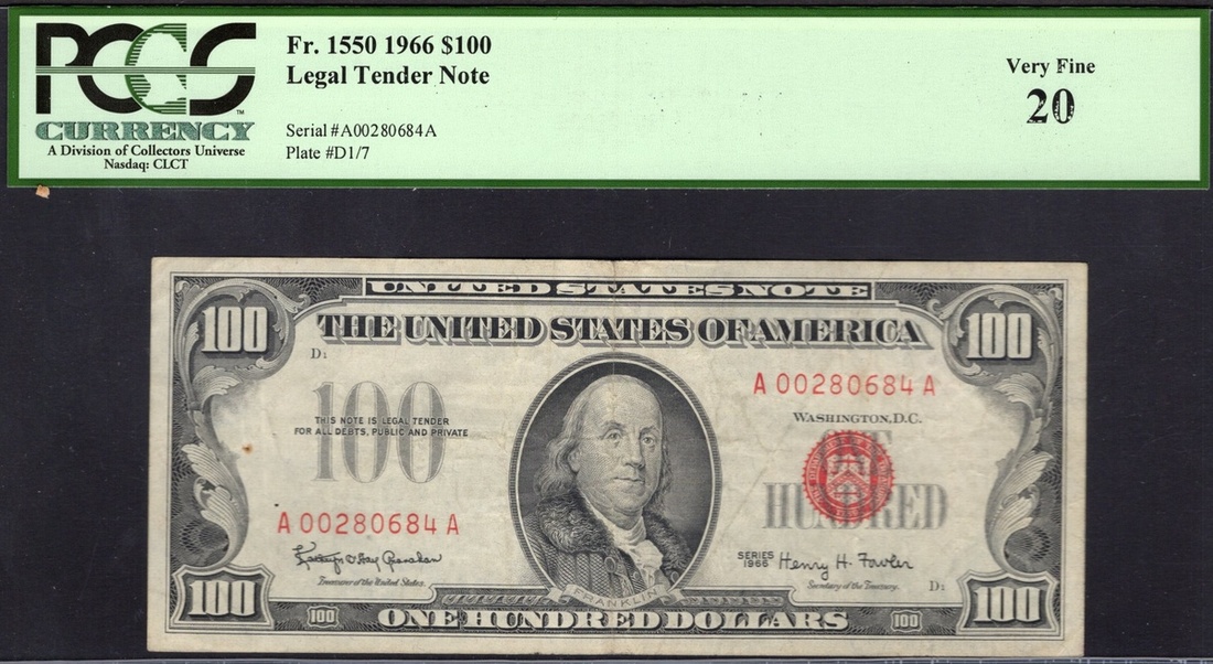 Fr. 1550. $100 Legal Tender. 1966. Franklin. Granahan-Fowler. No. A00280684A. PCGS Very Fine 20.