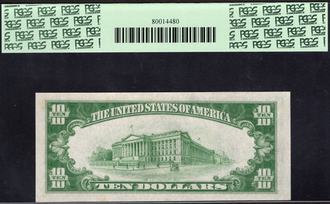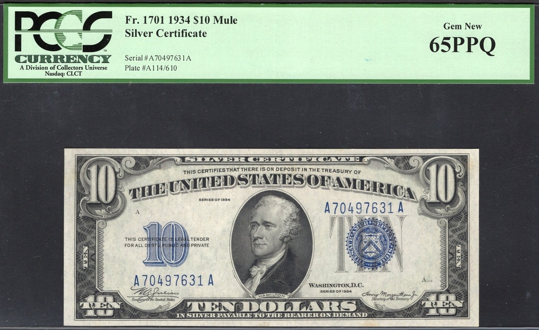 Fr. 1701m. $10 Silver Certificate. 1934. Mule. Hamilton. Julian-Morganthau. No. A70497631A, plate A114/610. PCGS Gem New 65 PPQ.