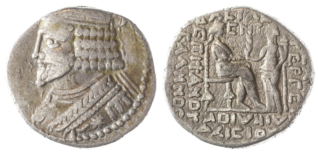 Parthian Empire. Vardanes I (Ca. AD 38-46). Billon Tetradrachm, dated SE 356 (AD 44/5). Seleukeia on the Tigris. 13.79 gm. Diademed bust left, rev. Vardanes seated right, receiving palm frond from Tyche standing left, holding cornucopia, year above. Sellwood 64.18 var, Shore 352. Very Fine.