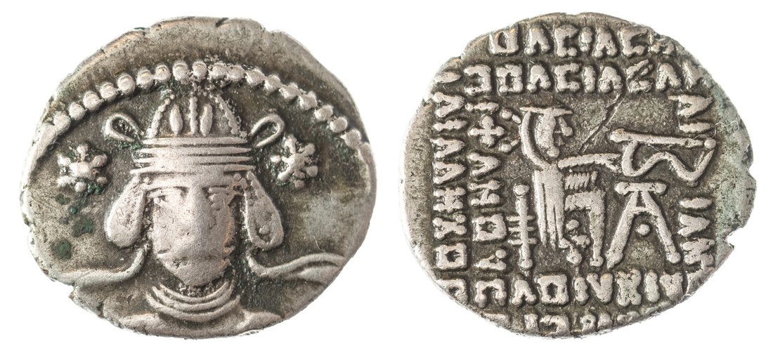 Parthian Empire. Meherdates, usurper (AD 49-50). AR Drachm. Ekbatana. 3.69 gm. Facing bust wearing tiara flanked by stars, rev. Archer seated right, holding bow, monogram below. Sellwood 67.1 (Vonones I), Shore 368 (Vonones I). Fine-about VF.