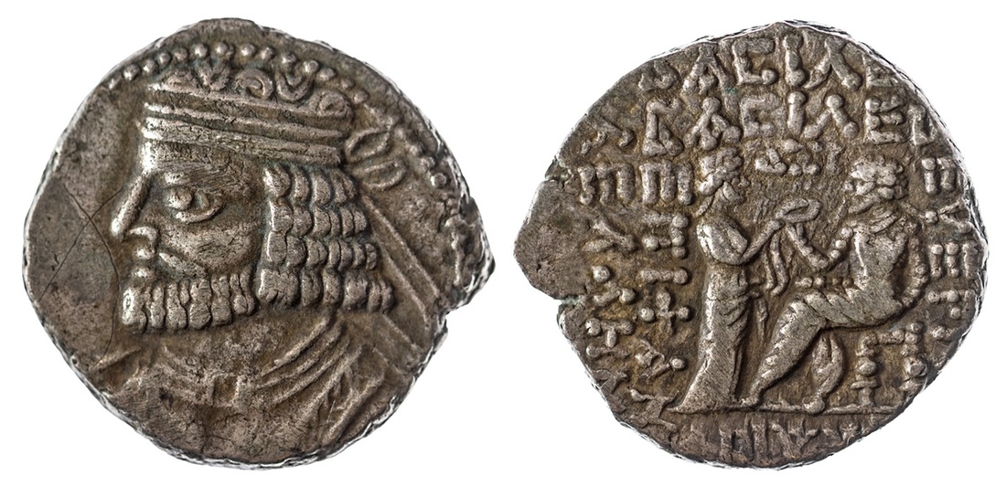 Parthian Empire. Vologases I (AD 51-78). Billon Tetradrachm, dated SE 364 (AD 51/2). Seleukeia on the Tigris. 14.76 gm. Diademed bust left, rev. Vologases seated left, receiving diadem from Tyche standing right, date above. Sellwood 68.9var. Toned over old test X in obverse field. Very Fine.