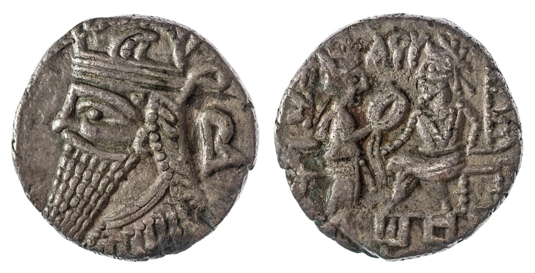 Parthian Empire. Vologases IV (AD 147-191). Billon Tetradrachm, dated SE 494 (AD 183). Seleukeia on the Tigris. 12.78 gm. Diademed bust left wearing tiara, B behind, rev. Vologases seated left receiving diadem from Tyche standing right, date above. Sellwood 84.78, Shore 431. Strong strike. Good Very Fine.