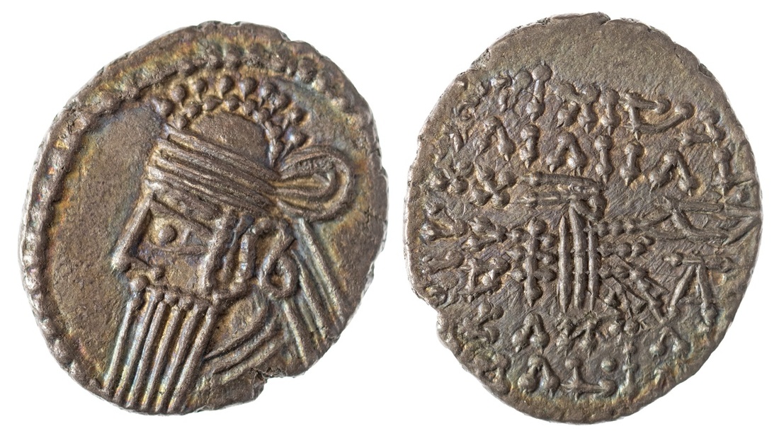 Parthian Empire. Vologases IV (ca. AD 147-191). AR Drachm. Ekbatana. 3.44 gm. Diademed bust left wearing tiara, rev. Archer seated right, holding bow, monogram below. Sellwood 84.131. Iridescent tone. Near Extremely Fine.