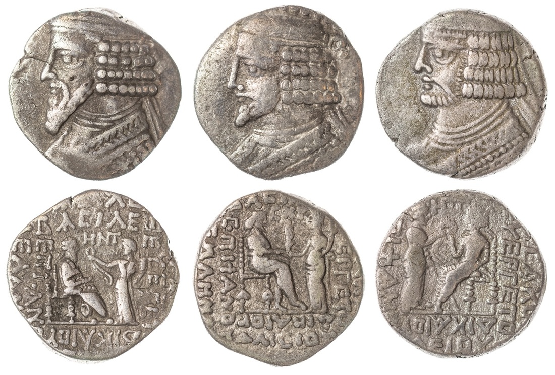Parthian Empire. Trio of Billon Tetradrachm. Issues of Vardanes I (ca. AD 38-46), Gotarzes II (ca. AD 44-51) and Vardanes II (ca. AD 55-58). Sellwood 64.24, 65.8, 69.7. One with light obverse scratches. Very Fine. (3)