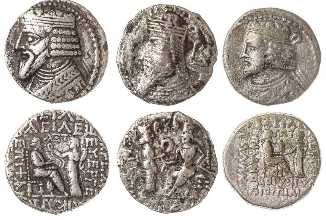 Parthian Empire. Trio of Billon Tetradrachm. Issues of Vardanes I (ca. AD 38-46), Gotarzes II (ca. AD 44-51) and Vologases VI (ca. AD 208-228). Sellwood 64.9, 65.27, 88.5. Slight porosity, the latter with some deposits. About VF-VF. (3)