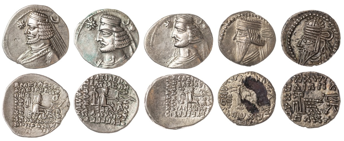 Parthian Empire. Lot of AR Drachm. Orodes II (57-38 BC). Sellwood 48.6 (3). One with light greening from PVC; Pakoros I (ca. AD 78-1200. Sellwood 78.5 (Vologases III). Reverse corrosion pitting; and Osroes II (ca. AD 190). VF-Near EF. (5)
