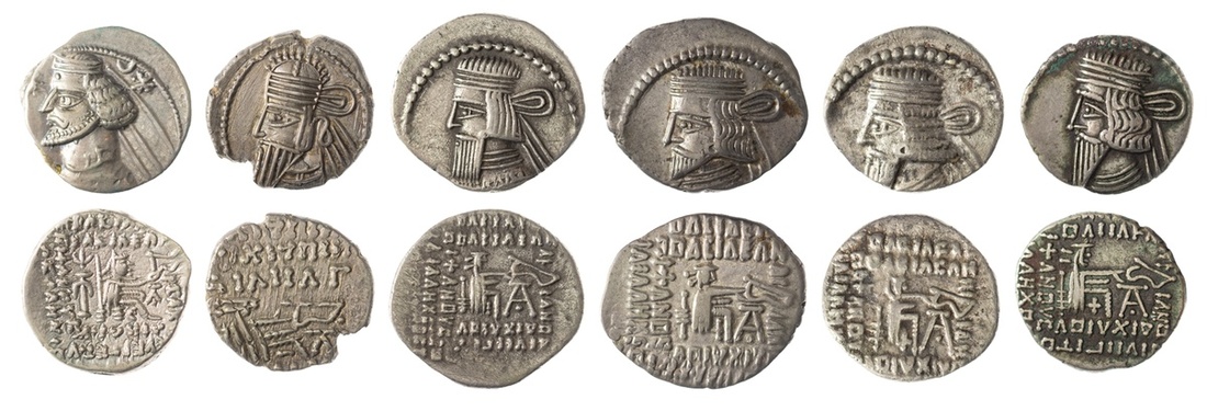 Parthian Empire. Lot of AR Drachm. Issues of Vardanes I, Orodes II, Vologases I, III, Artabanos II and Osroes II. One with light porosity. VF-EF. (6)