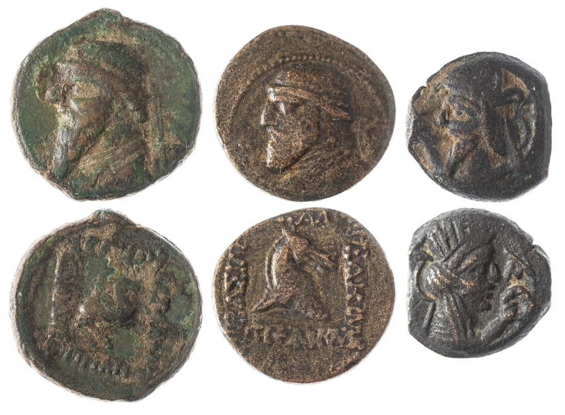 Parthian Empire. Trio of AE Dichalkoi: Mithradates II (121-91 BC). 4.8 gm. Bust left/Horse running right; 3.4 gm. Rev. Horse head right; and Vologases III (ca. AD 105-147). 3.3 gm. Bust left/Tyche bust right. About VF-VF. (3)