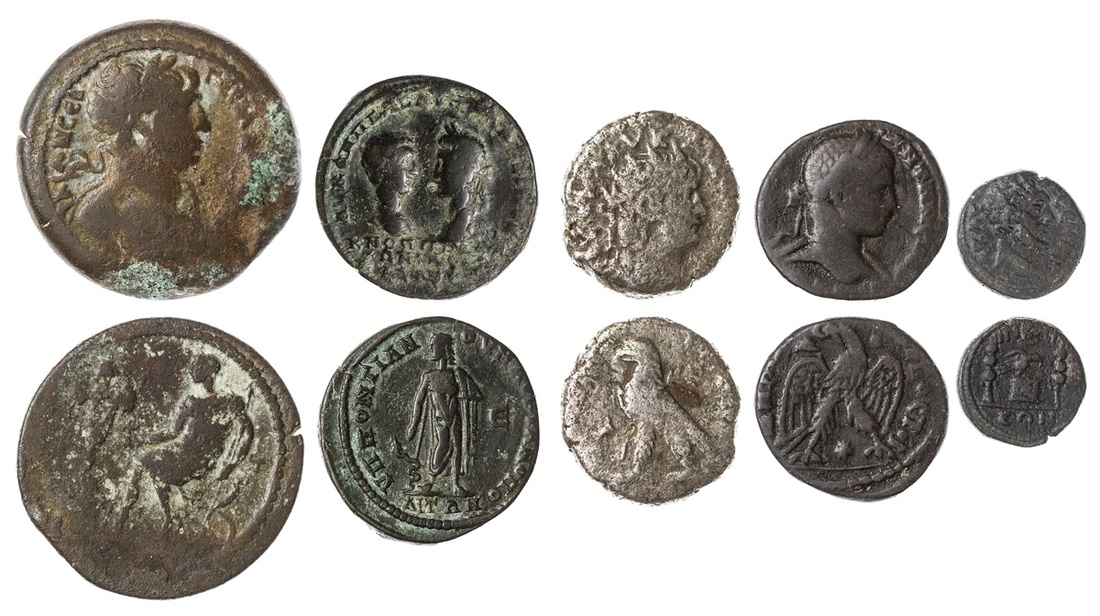 Roman Provincial Lot. Nero, Billon Tetradrachm of Alexandria. Rev: Eagle left. VG; Trajan. AE Drachm of Alexandria. Rev: Trajan seated left on curule chair, trophy and supplicant before him. Fine; Septimius Severus. AE 16 of Nicaea, Bithynia. Rev: Legionary eagle between standards. VF and rare; Elagabalus. Billon Tetradrachm of Antioch. Fine; Macrinus and Diadumenian. AE 27 of Marcianopolis, Moesia Inferior. Confronted busts/ Asklepios. F/VF. From the Baxter Collection. (5)
