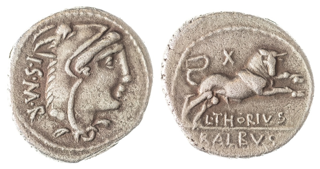 Roman Republic. L. Thorius Balbus. AR Denarius, 105 BC. 3.81 gm. Head of Juno Sospita right, wearing goat-skin headdress, rev. Bull leaping right, X above. Crawford 316/1; Syd. 598; Thoria 1. Toned. Very Fine. Fron the Baxter Collection.
