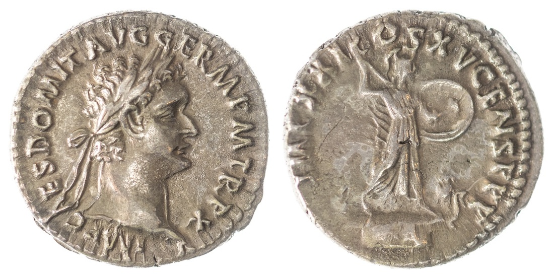 Roman Imperial. Domitian (AD 81-96). AR Denarius, struck AD 90-91. 3.40 gm. Laureate head right, rev. Minerva standing right on war galley, brandishing spear and shield, owl at her feet. RIC 153, RSC 266. Good Very Fine. From the Baxter Collection.