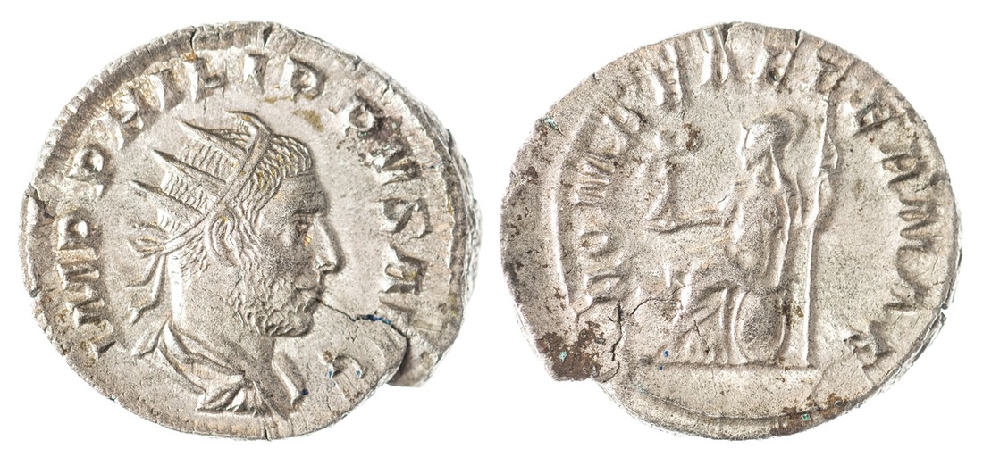 Roman Imperial. Philip I (AD 244-249). AR Antoninianus, struck AD 246. 4.11 gm. Radiate, draped and cuirassed bust right, rev. Roma seated left, holding Victory and scepter, shield at side. RIC 44b, RSC 169. Edge split. Good lustre, sharp portrait. Extremely Fine. From the Baxter Collection.
