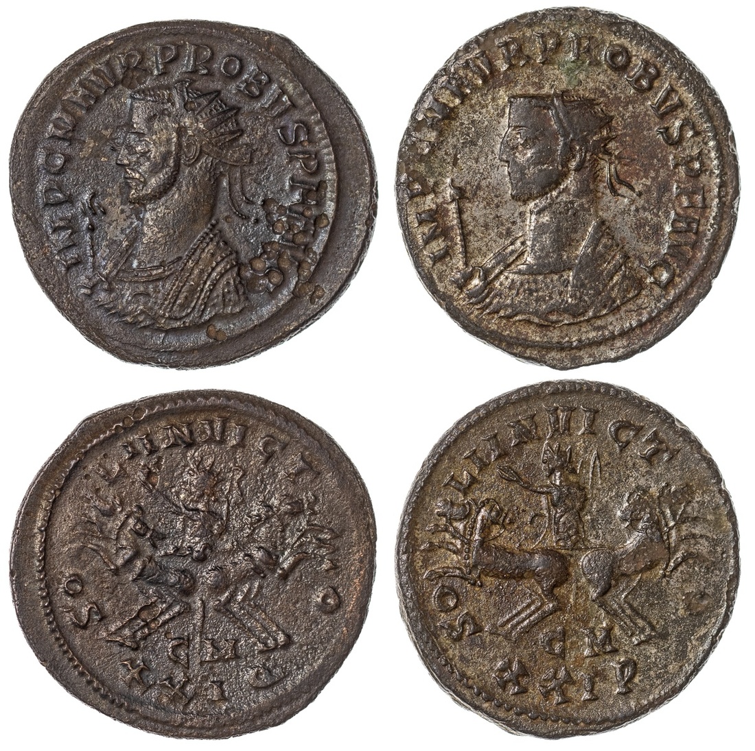 Roman Imperial. Probus (AD 276-282). Pair of Silvered Antoniniani. Cyzicus, 4th officina, third emission, AD 280. Radiate bust left. Wearing imperial mantle, holding eagle-tipped scepter, revs. Sol, head left, driving a facing, spread-out quadriga, raising hand and holding whip; CM, XXIQ below. RIC 911. Toned. Good Very Fine and Extremely Fine with light pitting. From the Baxter Collection. (2)