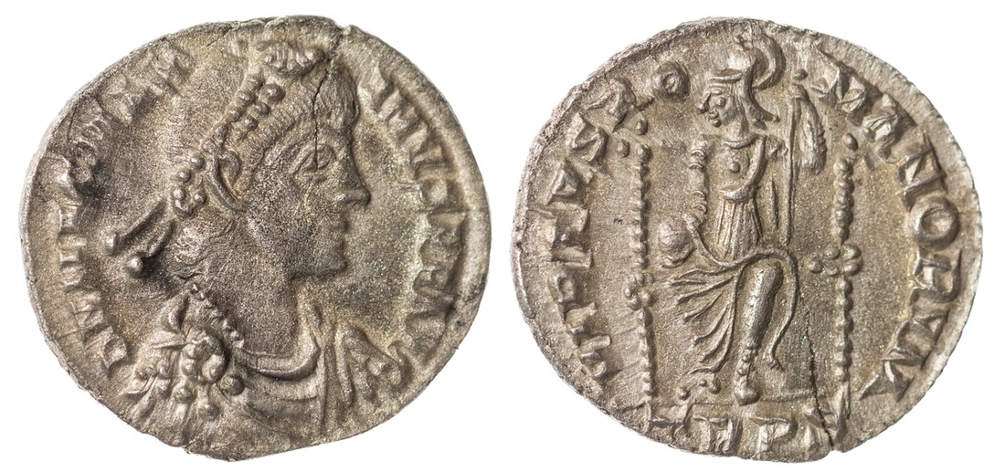 Roman Imperial. Magnus Maximus (383-388). AR Siliqua. Treveri (Trier). 1.93 gm. Pearl-diademed, draped and cuirassed bust right, rev. Roma enthroned facing, head left, holding globe and scepter, TRPS in ex. RIC 84. Thin edge split. Extremely Fine. From the Baxter Collection.