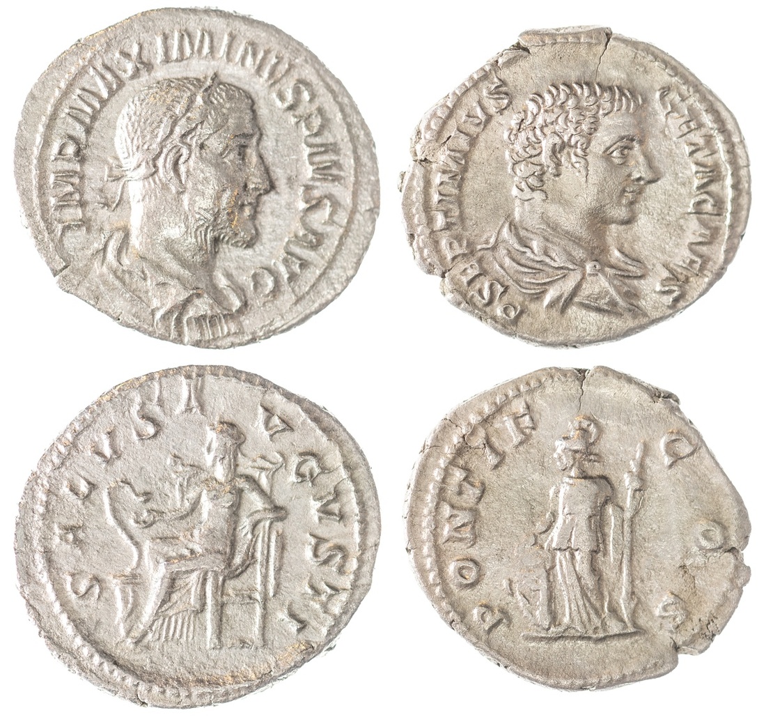 Roman Imperial. Pair of AR Denarii: Geta, as Caesar (AD 198-209). Bare-headed, draped bust right, rev. Minerva standing left, holding spear and leaning on shield. RIC 34; and Maximinus (AD 235-338). Laureate, draped and cuirassed bust right, rev.Salus seated left, feeding from patera a serpent rising from altar. RIC 14. Extremely Fine and Near EF. From the Baxter Collection. (2)