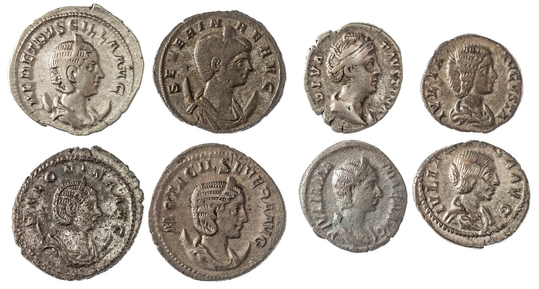 Roman Imperial. Lot of Imperial Ladies Issues. Includes: AR Denarii of Faustina, Sr., Julia Domna, Julia Maesa, and Julia Mamaea (grainy). Reverses: Vesta seated left, Venus standing left, Felicitas sacrificing, Fecunditas with child; and AR Antoniniani of Otacilia Severa, Herennia Etruscilla, and Salonina. Reverses: Concordia seated left, Pudicitia standing left, and Juno standing left, eagle at her feet; and Billon Antoninianus of Severina. Reverse: Concordia standing with two standards. About VF-Very Fine. From the Baxter Collection. (8)