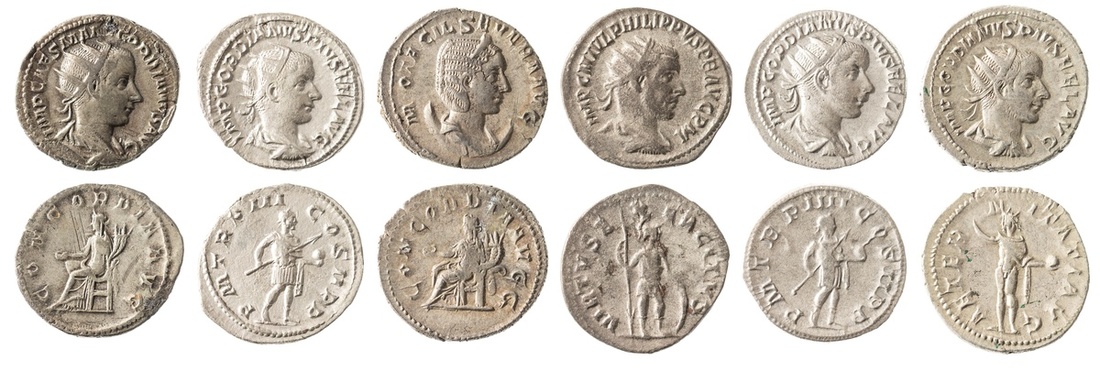 Roman Imperial. Sextet of AR Antoniniani. Gordian III (AD 238-244). Revs: Concordia seated left (scratches); Gordian standing right with spear and globe (2, var); Sol standing, raising hand and holding globe; Philip I (AD 244-249). Rev: Virtus standing right; and Otacilia Severa, Augusta (AD 244-249). Rev: Concordia seated left. Very Fine. From the Baxter Collection. (6)