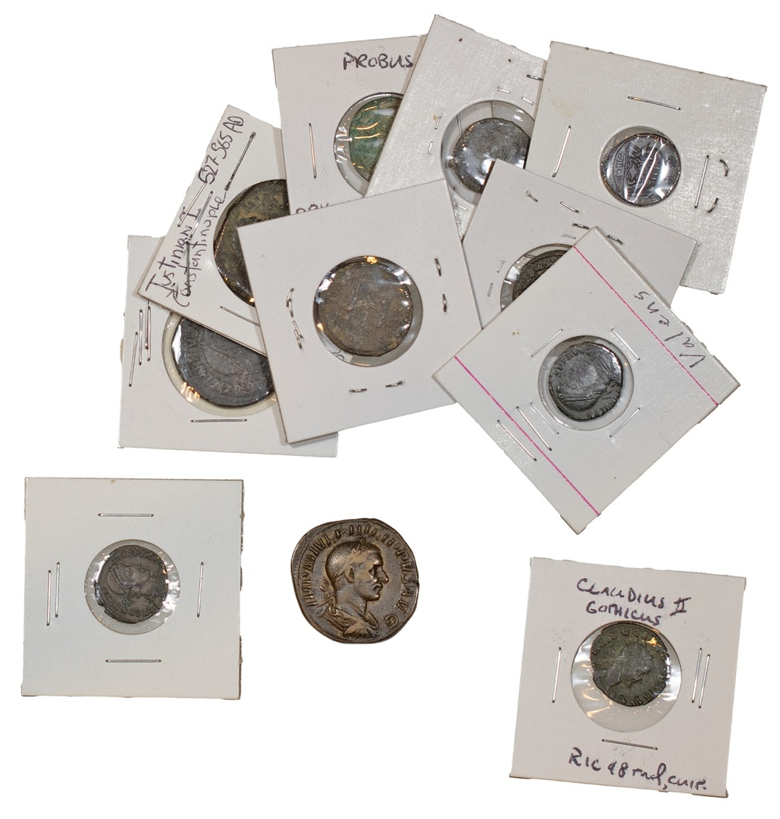 Roman Imperial. Lot of AEs. Includes Quadrans of Augustus (hands clasped). VG; Claudius and Caligula. RIC 90, 39. F-VF; an As of Agrippa. Pitting, About VF; a Sestertius of Philip I. RIC 172a. VF; late 3rd-4th Century - AE3s, AE4s, Antoniniani, Cententionalis, Folles. Includes issues of Procopius, Claudius II, Aurelian, Probus, Galerius, Maxentius, Licinius I and II, Crispus, Constantine I, Constans Constantius II, Constantius Gallus, Magnentius, Valens, Valentinian I and Arcadius; also a Billon Antoninianus of Valerian. Fine to Extremely Fine. From the Baxter Collection. (32)