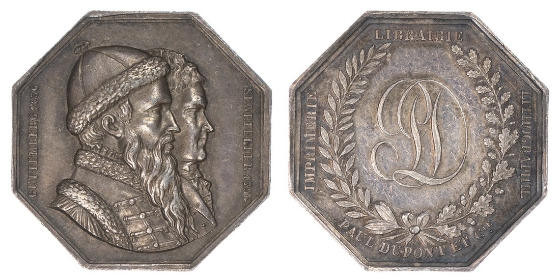 France. Third Republic. In Honor of Johannes Gutenberg. Medal, (1903). Silver, 75mm. 176.7 gm. By Léon Deschamps. Gutenberg bust left in field of quatrefoils, rev. Printing press; LA LVMIERE FVT. Edge: (cornucopia)ARGENT. Jehne 226. Toned. Extremely Fine; also octagonal Silver Jeton. Paul Dupont et Cie - Imprimerie, Librairie, Lithographie. Busts of Gutenberg and Senefelder right, rev. Company monogram within wreath. Toned. Extremely Fine. (2)