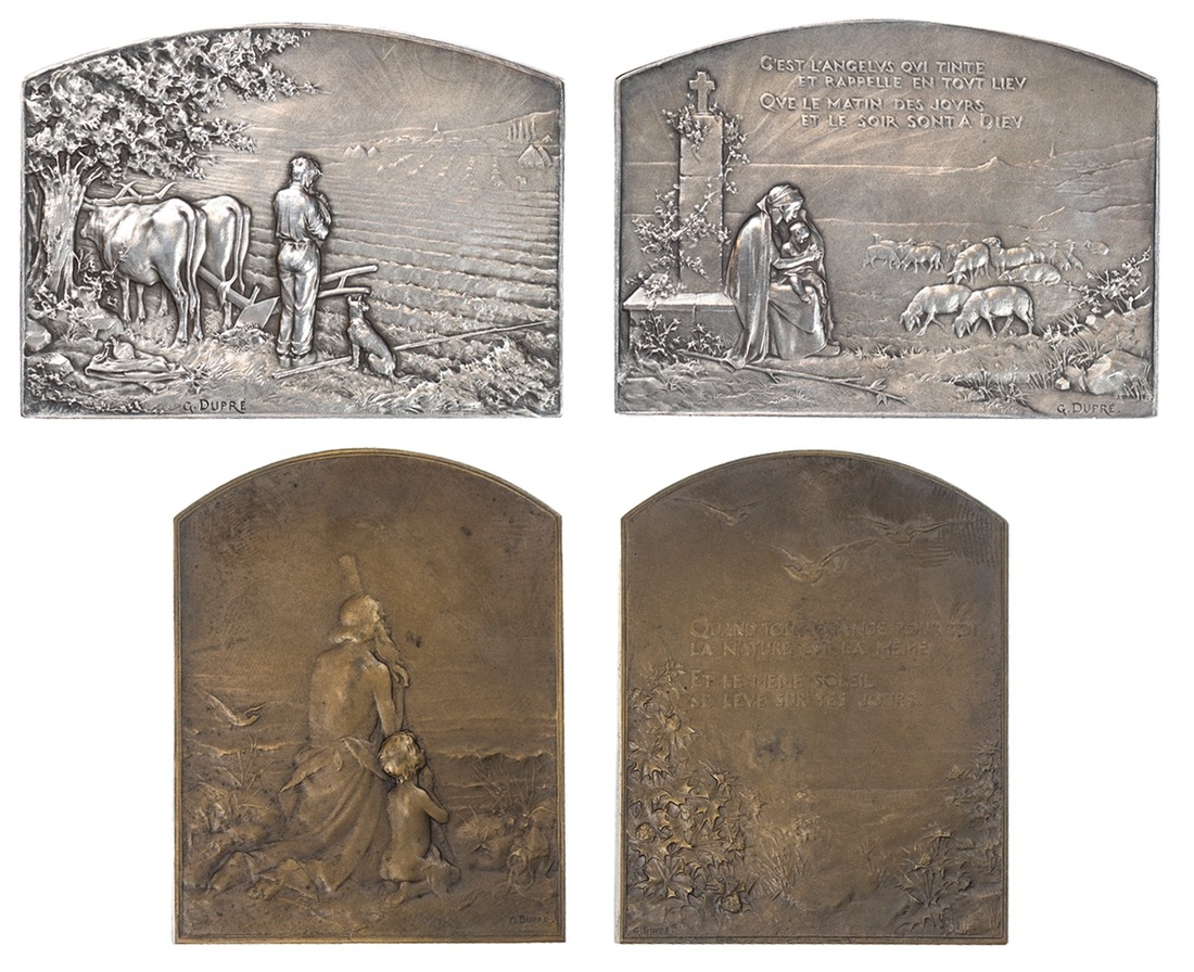 France. Third Republic. Pair of Plaques by Georges Dupre. Angelus Rings. Silver, 71 x 52mm. 87.1 gm. Farmer standing in orchard praying, between yoke of oxen and dog / Woman and child seated on a cross-topped monument, flock of sheep before them, "It is Angelus who rings and reminds [us] everywhere that the morning of days and the evening belong to God". Edge: (cornucopia)ARGENT; and Salut au Soleil. Bronze, 50.3 x 64mm. Old man and child kneeling, praying before rising sun / Floral scene at water's edge, birds flying above legend. AU-Uncirculated. (2)