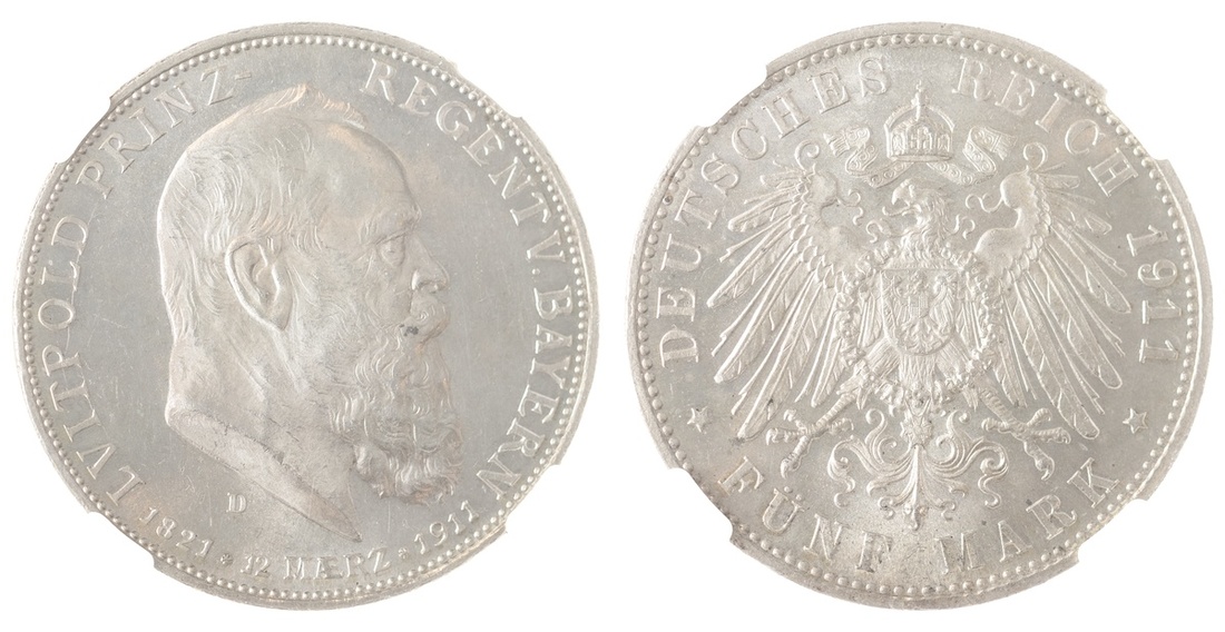 German States. Bavaria. Otto (1886-1913), under the Regency of Prince Luitpold. 5 Mark, 1911 D. On Prince-Regent Luitpold's 90th Birthday. Bare head right, rev. Imperial eagle. KM 999. Frosty devices in lustrous fields. NGC MS 64.