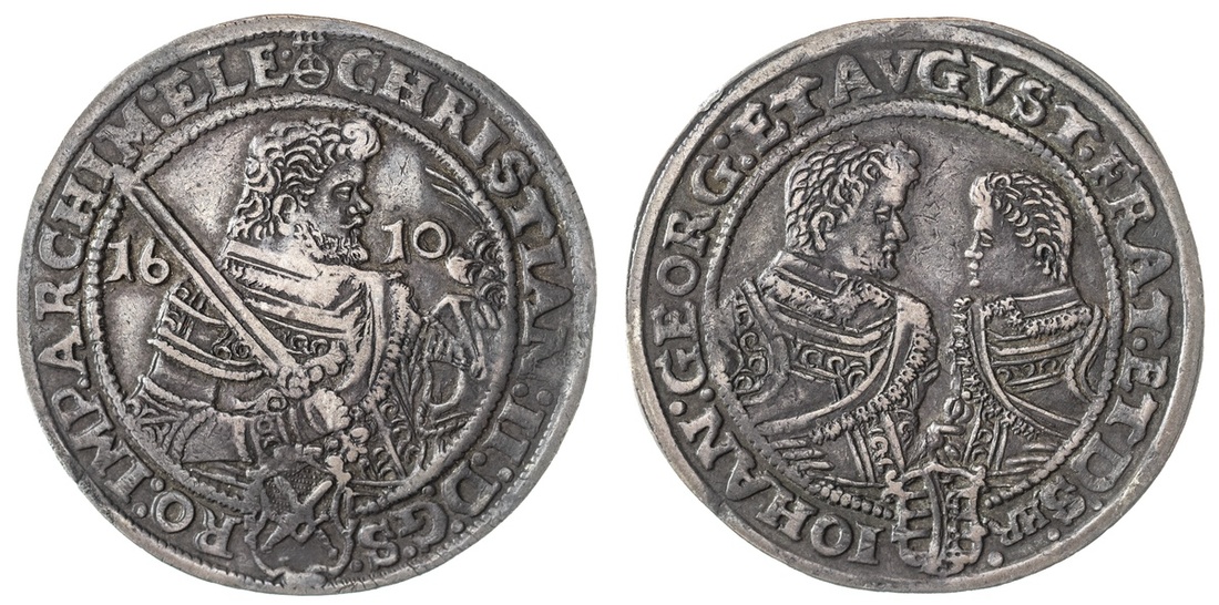 German States. Saxony - Albertine. Christian II, Johann Georg I and August (1591-1611). Taler, 1610 HR. Dresden. Bare-headed armored half-figure of Christian II right, holding sword against shoulder and helm, dividing date, rev Bare-headed, armored half figures of Johann Georg and August facing each other. Dav.7566, KM 24. Slate gray. Good Very Fine.