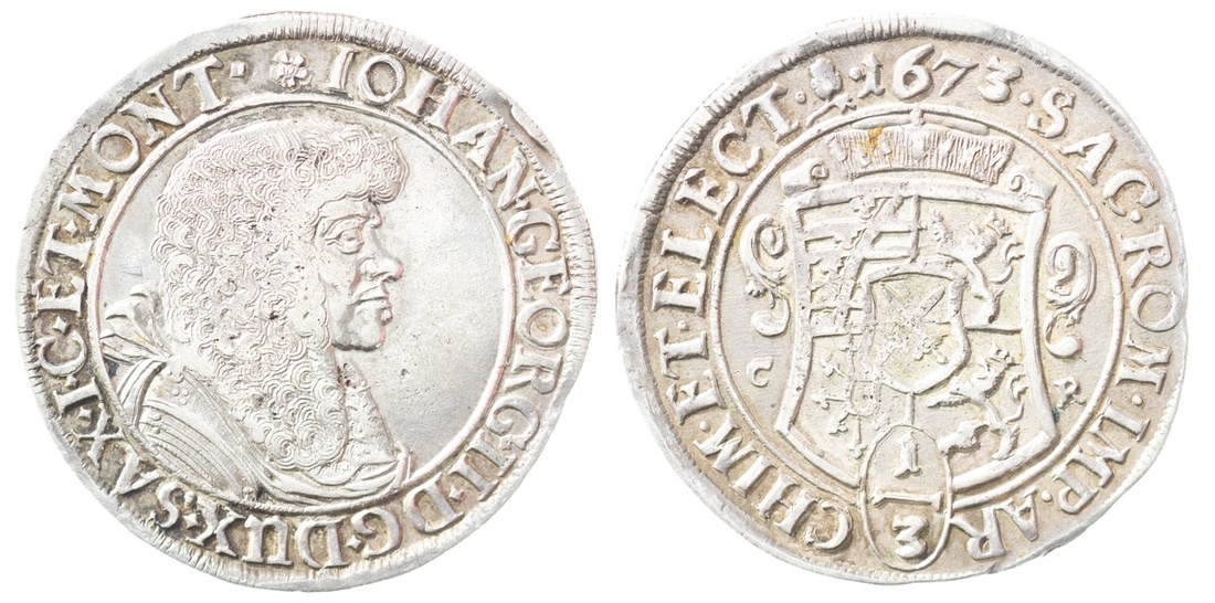 German States. Saxony. Johan Georg II (1656-1680). 1/3 Taler, 1673 CR. Peruked, draped and armored bust right, rev. Crowned Arms, fractional value in cartouche below, KM 547. Minor weakness of strike at centers, and small rim flaw. Lightly toned. About Extremely Fine.