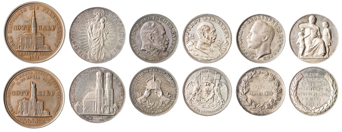 Germany. Sextet of Medals. Silver -- Bavaria. 400th Anniversary of the Frauenkirche, 1894. 38mm. By Borsch; Wilhelm I Birth Centennial 1897. 34mm. Unsigned; Wartime Bread Distribution, 1915. 33mm. By Lauer; Hesse-Darmstadt. Ernst Ludwig. Bravery Medal. Loop removed, 33mm; Bronze -- Frankenstein City Hall Reliquary Medal, 1861. 42mm. Made with copper from the City Hall fire roof. By Loos; Bismarck's 80th Birthday, 1895. Silvered AE, 34mm. By Mayer. Very Fine-AU. (6)