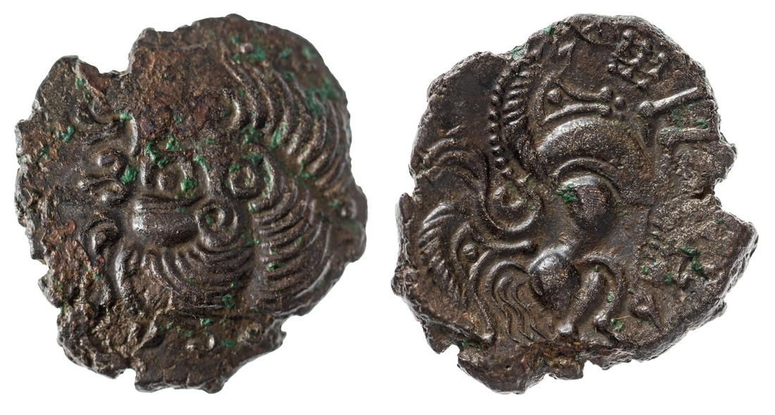 Celtic Britain. Imported Coinage. Armorican (Channel Islands and NW Gaul), ca. 75-50 BC. Billon Stater. 6.20 gm. Celticized head right, anchor-shaped nose, rev. Celticized horse, boar below, cross in square before. S.16. Obverse earthen green hues. Extremely Fine.